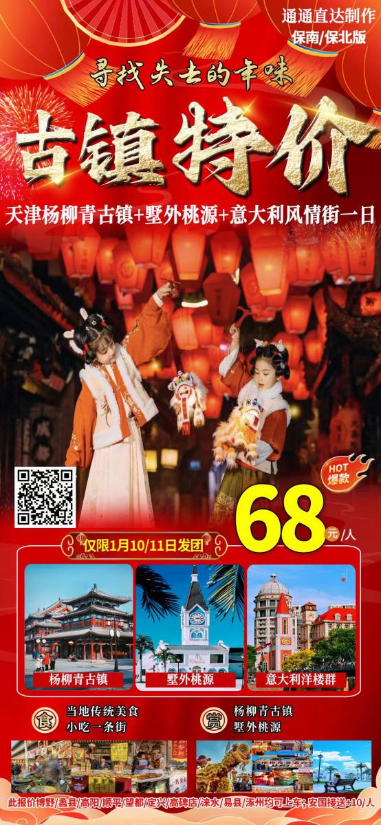 旅游 🔥天津限时钜惠 🔥 💞48元!一天逛遍“古镇年画、桃源秘境、欧洲街头!保南保北接送费...